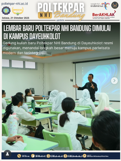 Hari ini, lembar baru dalam perjalanan Politeknik Pariwisata NHI Bandung resmi dimulai. Untuk pertama kalinya, gedung kuliah baru di kawasan Dayeuhkolot digunakan sebagai tempat kegiatan akademik.