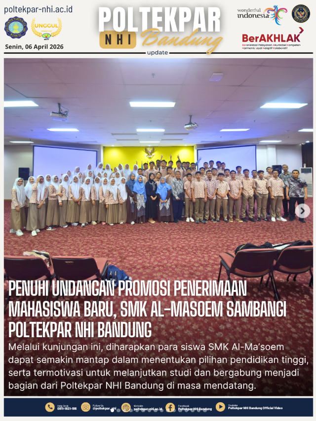 Kunjungan SMK Al-Ma’soem ke Politeknik Pariwisata NHI Bandung menjadi momen penting dalam rangka promosi Penerimaan Mahasiswa Baru (PMB), sekaligus memberikan wawasan komprehensif kepada siswa mengenai pendidikan tinggi vokasi di bidang pariwisata.