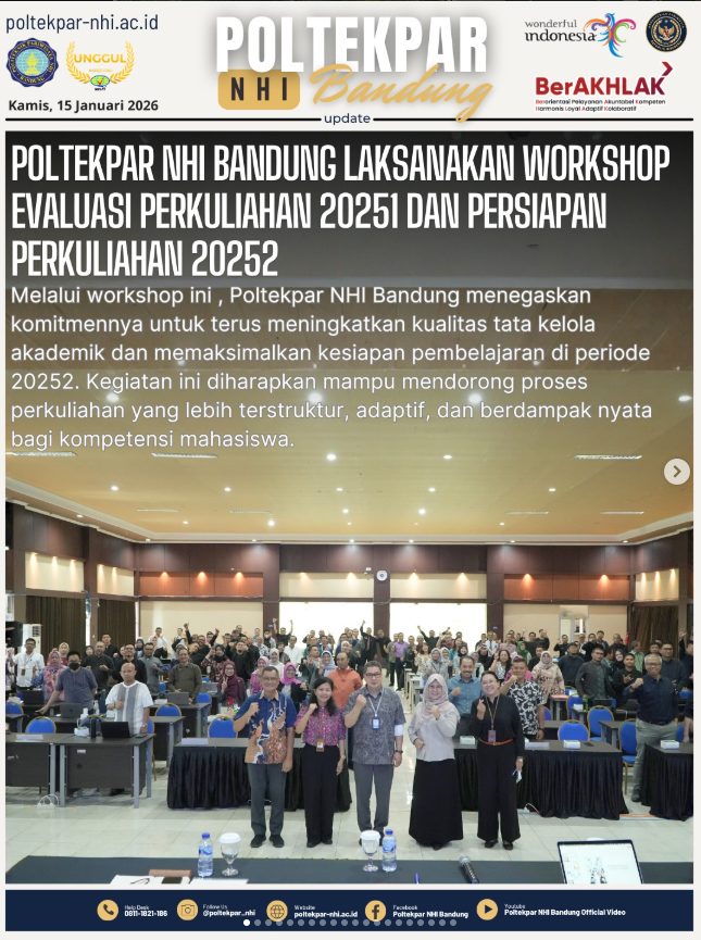 Poltekpar NHI Bandung melaksanakan Workshop Evaluasi Perkuliahan Periode 20251 dan Persiapan Perkuliahan Periode 20252 pada 13–14 Januari 2026 bertempat di Gedung Mandalawangi Convention Lantai 2.