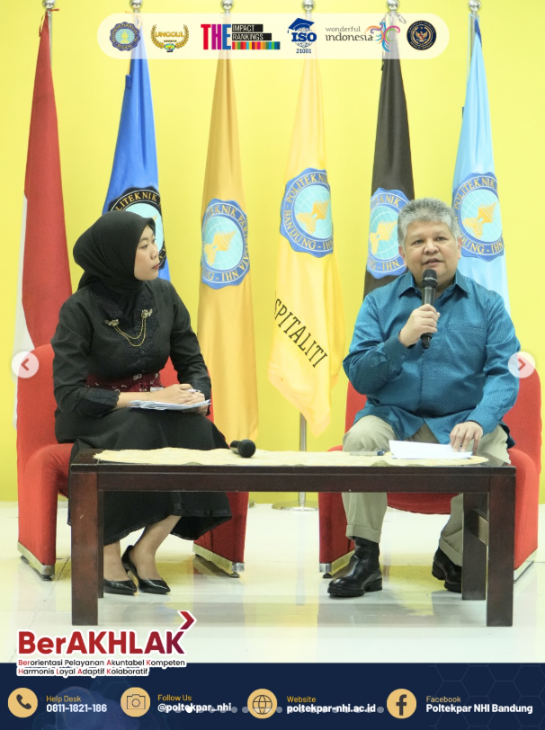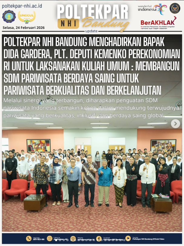 Politeknik Pariwisata NHI Bandung kembali menegaskan komitmennya dalam mendukung penguatan sumber daya manusia pariwisata melalui penyelenggaraan Kuliah Umum yang disampaikan oleh Dida Gardera, ST., M.Sc., Plt. Deputi Bidang Koordinasi Industri, Ketenagakerjaan dan Pariwisata Kementerian Koordinator Bidang Perekonomian Republik Indonesia.