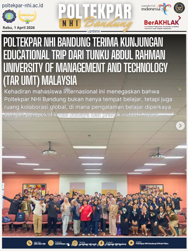 Salah satunya adalah kunjungan dari Tunku Abdul Rahman University of Management and Technology (TAR UMT), Malaysia, yang mengajukan program educational trip ke Bandung dengan Poltekpar NHI sebagai destinasi utama. Dalam kunjungan ini, sekitar 50–60 mahasiswa dari program studi seperti Gastronomy, Hospitality & Catering Management, serta Tourism Management direncanakan hadir untuk mengeksplorasi lingkungan akademik kampus.