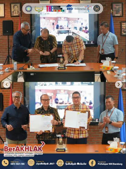 Pada kesempatan yang sama, dilakukan penandatanganan Memorandum of Understanding (MoU) antara Poltekpar NHI Bandung dan Ikatan Alumni NHI Bandung terkait Dukungan Pendidikan dan Kegiatan Mahasiswa, sebagai bentuk penguatan kerja sama institusional untuk mendukung pengembangan kompetensi mahasiswa.